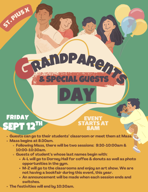 Grandparents Day is from 8:00 - 8:30. Grandparents can meet their grandchildren in their classrooms, or they are welcome to meet us at the Church. We will begin our day with Mass at 8:30. After Mass, we will have two sessions. Students, whose last names begin with A-L, will meet in the Activity Center, where they can enjoy coffee and donuts in Dorney Hall and then get a picture in the gym. Students, whose names begin with M-Z will go to the school building where they can engage in an activity in the classroom and/or enjoy the art show. At 10:00, we will switch. The day will conclude at 10:30. We are eagerly anticipating the day!